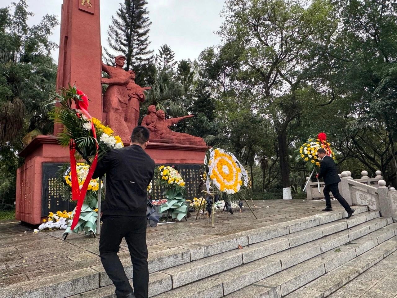 黨員代表邁著堅(jiān)定的步伐,緩緩走向烈士紀(jì)念碑,向烈士敬獻(xiàn)花籃。花籃上的緞帶隨風(fēng)飄動(dòng),仿佛在訴說(shuō)著對(duì)先烈們的無(wú)盡思念。代表仔細(xì)整理緞帶后,大家向烈士默哀鞠躬。